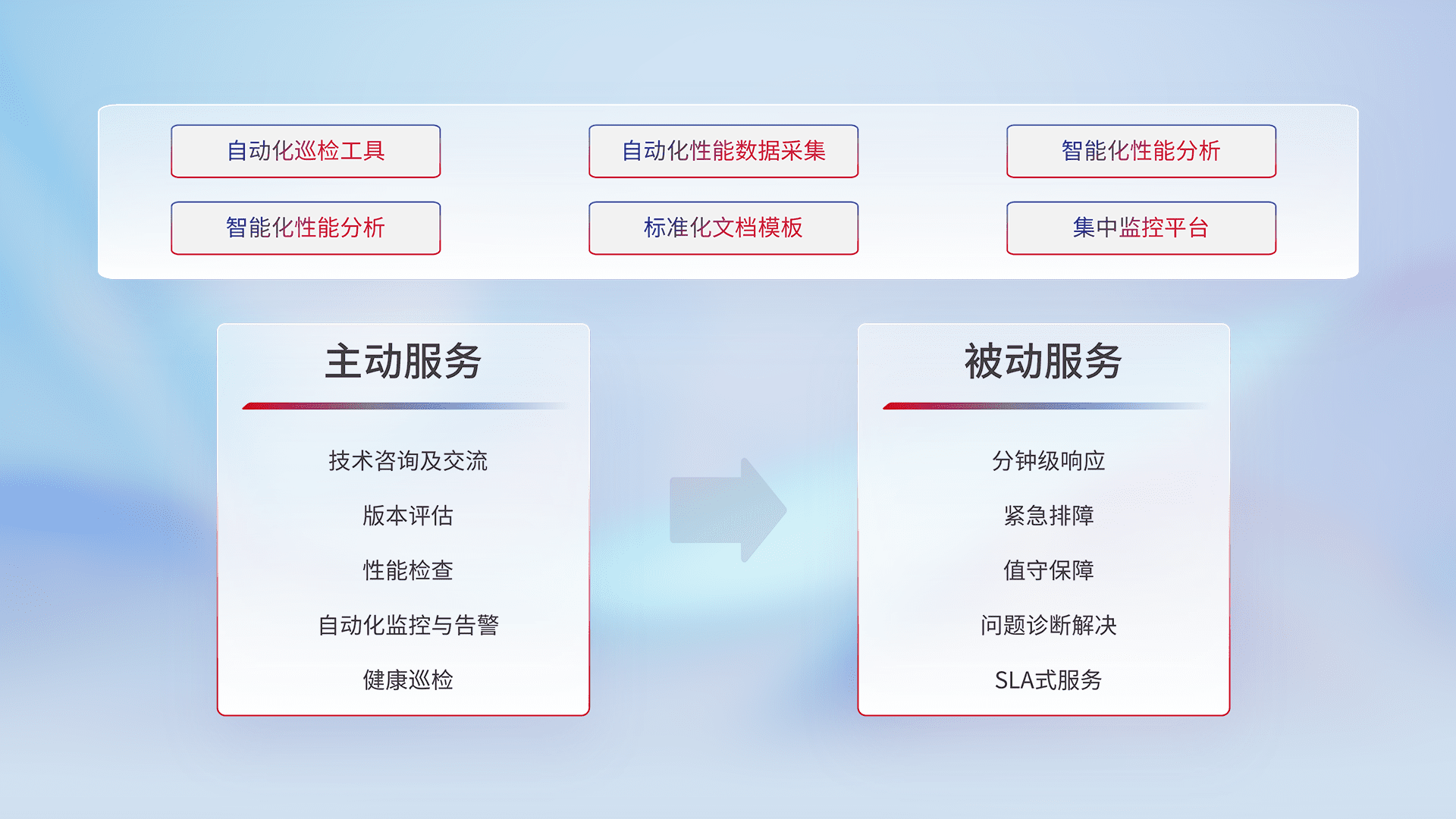 智能化工具和标准化文档,,保障服务质量,,,提供主动服务(包含技术咨询、、版本评估、、、性能检查、、、、自动化监控与告警、、、、健康巡检)和被动服务包含(分钟级响应、、、紧急排障、、值守保障、、、、问题诊断解决、、SLA服务)。。。