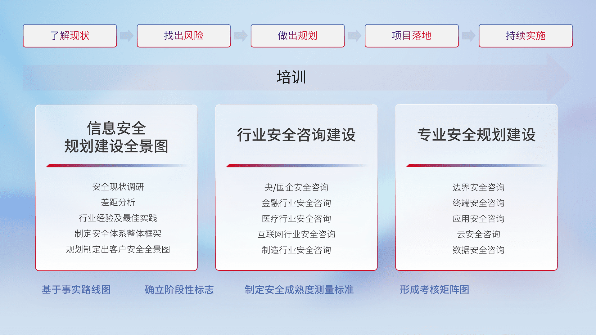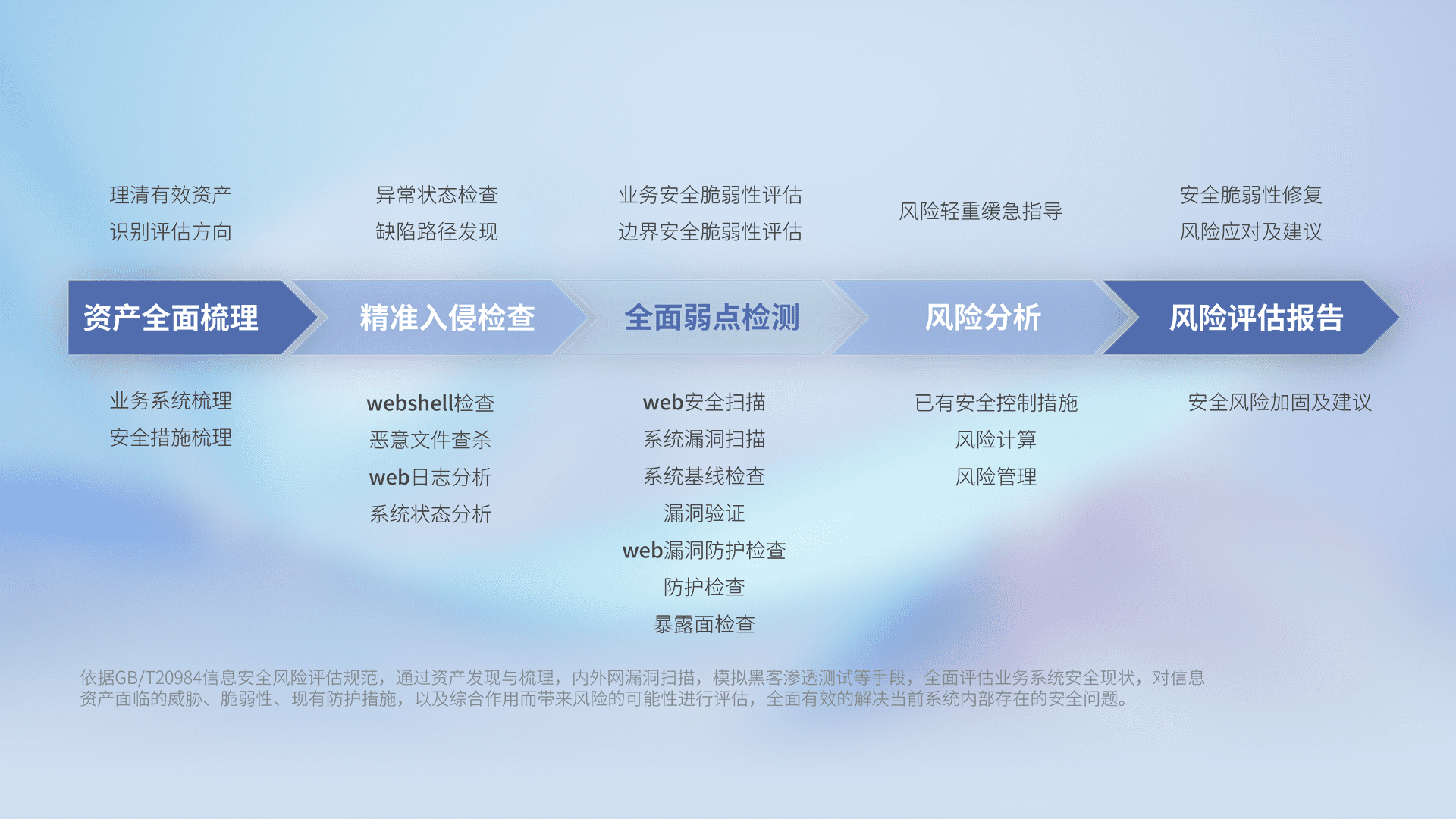 针对客户行业特性,,以专业的安全服务+多厂商联合解决方案提供专属的一站式安全管理服务,,帮助客户全面感知网络空间威胁,,,,基于识别、、、检测、、分析、、防护、、、监测、、、、响应的服务理论模型,,,,从方案咨询、、集成交付、、、评估验证、、优化加固、、运维运营,,,,致力于为客户提供完整的闭环管理式安全服务。。。。以实战经验为客户打造高抵御风险的安全体系,,,,帮助客户发现威胁、、对抗威胁、、、、处置威胁,,,,不断积累安全对抗能力,,,持续保障数字化安全。。。